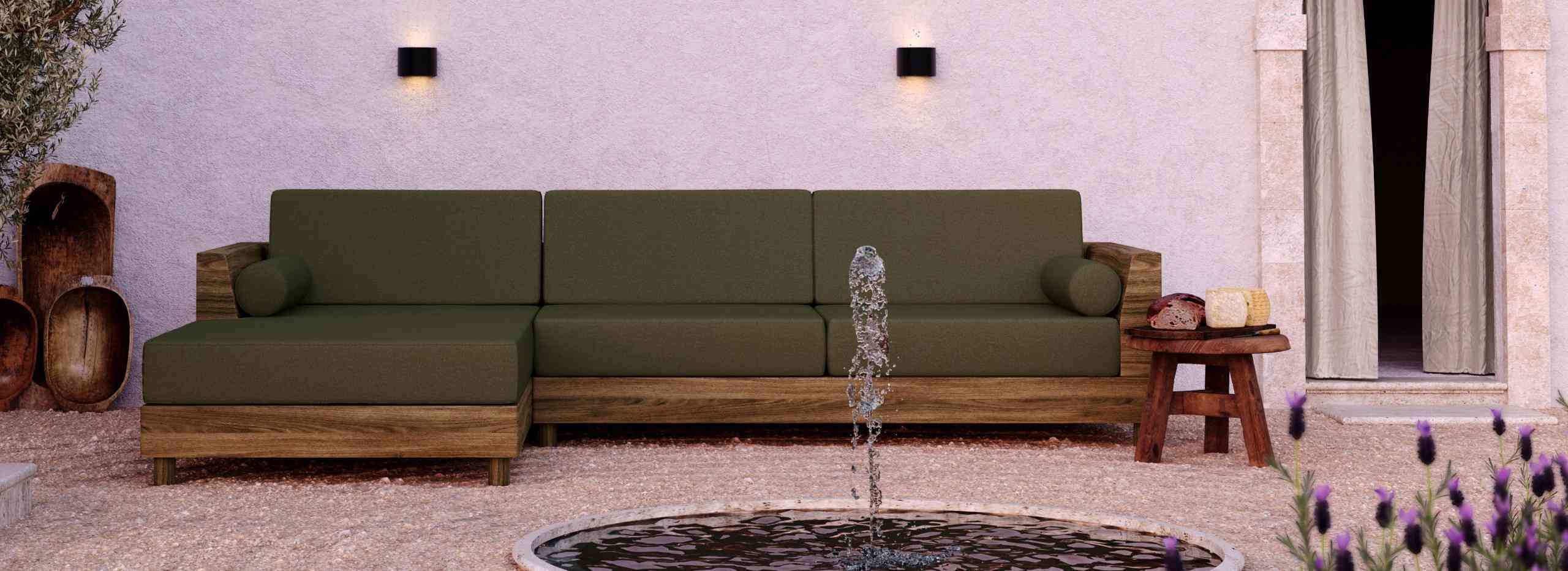 Bask in the serene charm of Mediterranean-inspired living with the Hampton Outdoor Sectional—where sculptural form meets the organic warmth of nature. Set against textured stone and surrounded by fragrant lavender and aged olive trees, this outdoor setting evokes a tranquil escape. The sectional’s solid acacia wood frame and deep green cushions offer a bold contrast, grounding the space in timeless elegance. It's a curated moment of calm, inviting you to experience refined luxury living beneath open skies.
